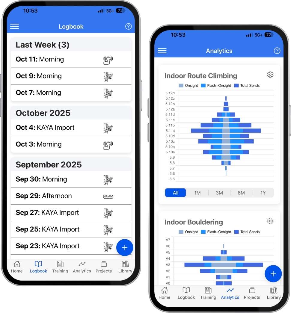 Log routes, boulder/board problems, attempts, strength training sessions, hangboarding, and more.